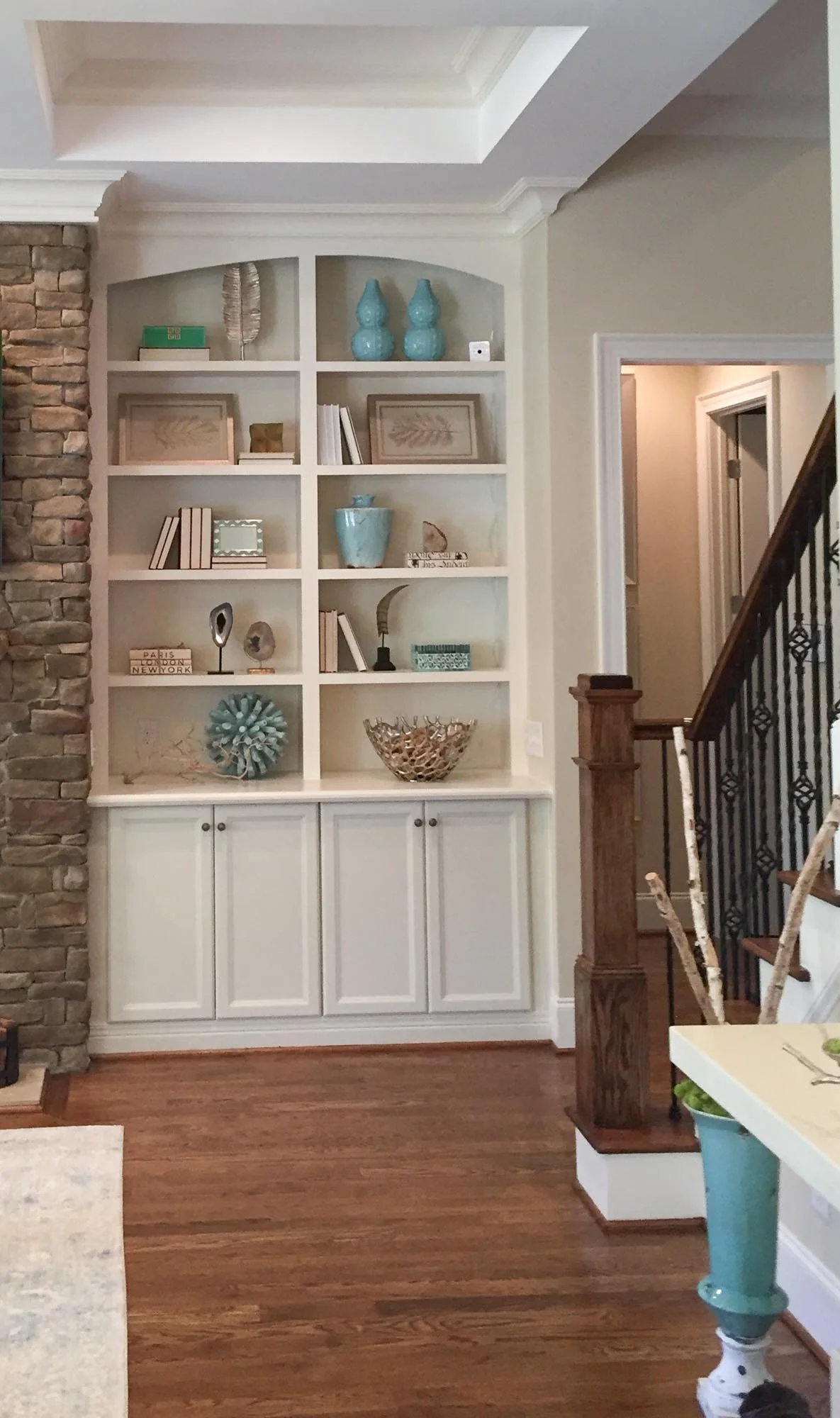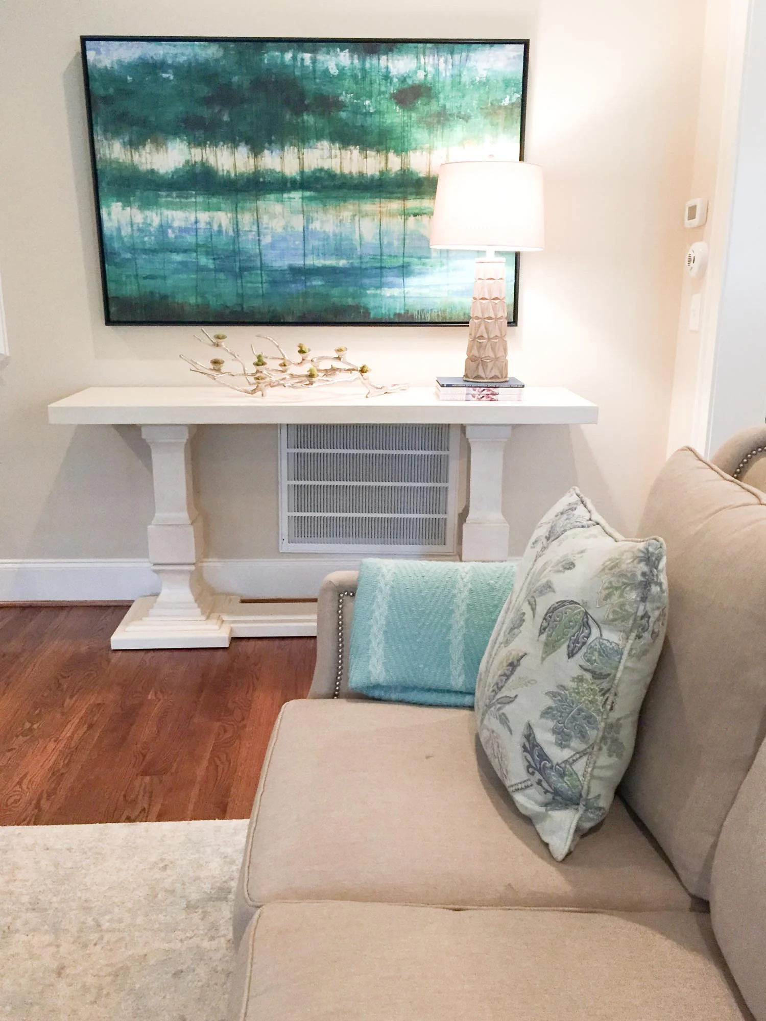 Guest bedroom with floral pillow shams and wooden mirror hanging on wall